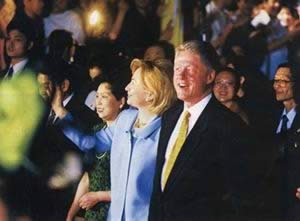 1998年6月25日,美国总统克林顿抵达西安,开始对中国进行为期九天的正式访问,这是他入住白宫五年之后第一次访问中国,也是1989年2月布什访华以来,美国在任总统首次访华。27日,在北京人民大会堂东门外广场,国家主席江泽民主持仪式欢迎克林顿来访。