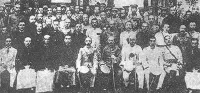 张作霖和吴佩孚在北京会晤,商定联合。图为会晤时同诸将领合影。前排左五为张作霖、左六为吴佩孚1926年6月28日,张作霖、吴佩孚在北京会晤,联合起来组建北京政府。4月,奉鲁军进入北京。北京政权因吴佩孚、张作霖的