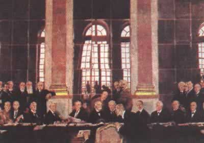 当乔治-克列孟梭(中间,有白胡者)在凡尔赛的明镜大厅签署条约时,法国报了仇。1871年法国含辱失败后,也是在明镜大厅宣布日尔曼帝国成立