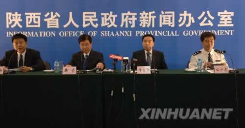 6月29日,陕西省政府新闻发言人、省政府办公厅负责人徐春华(右二),省公安厅新闻发言人、副厅长白少康(右一),省监察厅新闻发言人、副厅长岳崇(左二)通报『华南虎照片事件』调查处理情况。