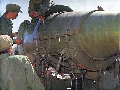1964年——『东风二号』导弹在酒泉发射场点火升空,获得成功,标志着我国导弹事业从此走上了自主研制的道路。上图是我国60年代自主设计研制的东风二号中程弹道导弹,全长21.3米,重量近30吨,直径1.65米,最大射程1200公里,可携带一枚2万吨TNT当量的核弹头,1968年装备部队,1983年退役。12月5日,该枚导弹运抵浙江台州椒江区,是解放军第二炮兵部队赠送给该馆的珍贵礼物,供游人参观。下图为弹头。