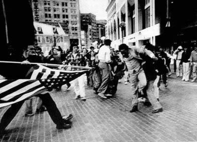 就在这一天,波士顿却发生了一起极不光彩的冲突事件,白人青年居然用星条旗作武器,刺向赤手空拳的黑人