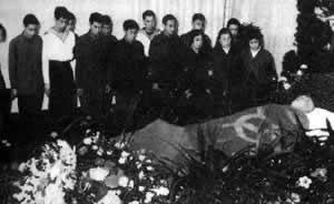 朱德夫人康克清(前排右2)等家属在朱德遗体告别仪式上。