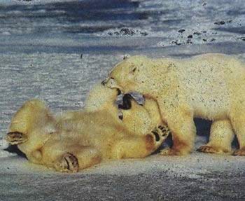 两只顽皮的北极熊在冰面上嬉戏