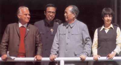 1970年10月,毛泽东会见美国记者、作家埃德加-- 斯诺,向他表达了欢迎美国总统尼克松访华的意愿。图为10月1日毛泽东与斯诺(左1)在天安门城楼上。