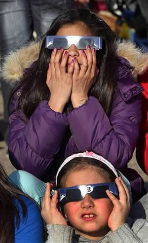 在智利西北部的科金博港,孩子们正在观测日全食。