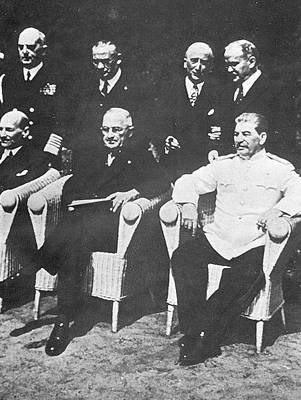 苏、美、英三国首脑斯大林(前右)、杜鲁门(中)、丘吉尔出席波茨坦会议的资料照片
