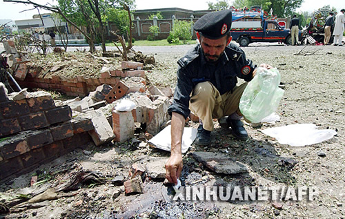 2007年7月19日,巴基斯坦西北边境省亨古镇一所警察训练学校发生爆炸后,一名警察在爆炸现场搜集证据。