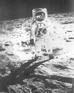 把仪器检查了三个小时之后,两个宇航员问休斯顿,他们可否省去预定的四个小时休息时间而就在现在下机。休斯顿回答说,『我们支持你们这一行动。』他们穿上了价值三十万美元的太空衣,降低了登月舱内的压力。接着,阿姆斯特朗背朝外,开始从九级的梯子上慢慢下去。在第二级阶梯上他拉了一根绳子,打开了电视照相机的镜头,让五亿人看到他小心地下降到荒凉的月球表现上去。 他的九号半B的靴子接触到了月球表面,他说:『对一个人来说,这是小小的一步,但对人类来说,这是一个巨大的飞跃。』这时是下午10点56分20秒。他拖着脚步在地上走来走去。他说,『月球表面是纤细的粉末状的,它象木炭粉似的一层一层地粘满了我的鞋底和鞋帮。我一步踩下去不到一英寸深,也许只有八分之一英寸,但我能在细沙似的地面上看出自己的脚印来。』