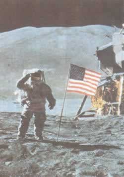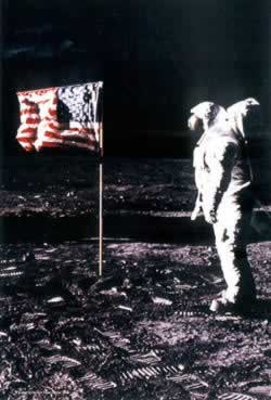 阿姆斯特朗把那细粉放一些在他太空衣的裤袋里。接着,在他下舱后十九分钟,奥尔德林走到他身旁来说,『美呵,美呵,壮丽的凄凉景色。』阿姆斯特朗把一根标桩打入土里,把电视摄影机架在上面。样子象蜘蛛的『鹰』舱离镜头六十英尺远,正处于电视图象的中央,它后面就是外层空间的永恒的夜。这里的重力是六分之一个G,仅及地球上重力的百分之十六点六。电视观众们看到这两人象羚羊似的跳来跳去,并听到奥尔德林说,『当我要失去平衡的时候,我发现恢复平衡是十分自然而又非常容易的事。』他树起了一面三英尺长五英尺宽的美国旗,它是用铁丝缚在旗杆上的;奥尔德林向它行礼。他们还存放了一个盛有七十六国领导人拍来的电报的容器和一块不锈钢的饰板,上面标着下列字样:『来自行星地球的人于纪元1969年7月第一次在这里踏上月球。我们是代表全人类和平地来到这里的。』