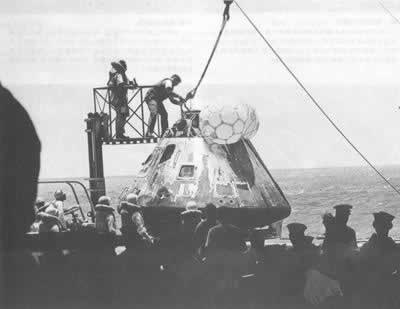 守候着的航空母舰『大黄蜂号』上的雷达已探测到正降落的『哥伦比亚』在十三点八英里外,在三个八十三英尺的橙色和白色的降落伞下疾降。接着,这指挥舱就溅落在海面上,激起六英尺高的大浪,并倾翻了。但经舱内三人努力把舷边的气袋充了气,就立即使它恢复了平衡。『大黄蜂』号上起飞的直升飞机在头顶盘旋,引导这只飞船开往目的地。尼克松总统在舰桥上挥动双筒望远镜。舰上的乐队吹奏起了『哥伦比亚,你是海上明珠』,在整个美国和许多外国城市里,教堂钟声四起,气笛长鸣,汽车驾驶人都按响了车上的喇叭。