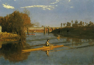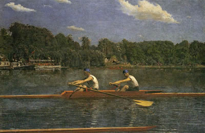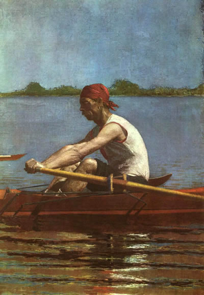 汤姆·考普斯维特·艾金斯(Thomas Cowperthwaite Eakins,1844年7月25日—1916年6月25日),美国现实主义画家、摄影家。生于费城,早年入读宾州美术学校。1866至68年,他在巴黎美术学院随让-里奥·杰洛姆学习,1869年往西班牙,接触了蒂埃哥•委拉士开兹和利贝拉等的作品,受到学院派和古典风格影响。1870年回费城,居于父母的家中,为亲人画了不少肖象画,亦画了一些户外活动的片段如划艇。