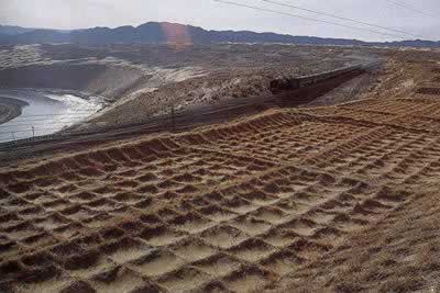 沙漠地带铺轨时,沿线筑起的防沙栏