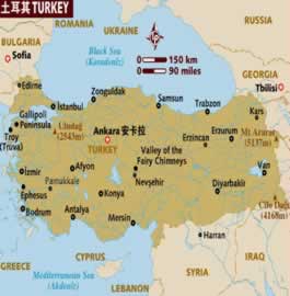 土耳其,全称土耳其共和国。意为『勇敢人的国家』。地跨欧亚两洲,亚洲部分占总面积的97%。面积814578平方公里(含境内水域)。人口6000万(1993),土耳其人占80%以上。官方语言为土耳其语。99%的人信奉伊斯兰教。首都安卡拉。矿藏中硼、锑、铬在世界占重要地位,此外还有铜、铁、煤等。森林面积2000万公顷。农业较发达,工业有一定基础。人均国民生产总值2685美元(1995)。主要农产品有小麦、大麦、棉花、烟草等,粮食自给有余。畜牧业发达,安卡拉羊世界著名。工业以纺织、食品为主,还有石油化工、冶金、水泥、汽车等。出口纺织品、农产品、石油制品、皮革、矿产品等;进口原油、机电产品、化工、车辆、煤炭、有色金属等。有伊斯坦布尔等多个港口。土耳其人史称突厥。8~13世纪突厥人迁至小亚细亚。14世纪建立奥斯曼帝国。15~16世纪极盛时期地跨欧、亚、非三洲。20世纪沦为英、法、德等国殖民地。1919年凯末尔发动民族革命。1923年10月29日(共和国日)建立土耳其共和国。奉行与西方结盟的政策。苏联解体后,密切了与这一地区国家的关系。1971年8月4日同中国建交。