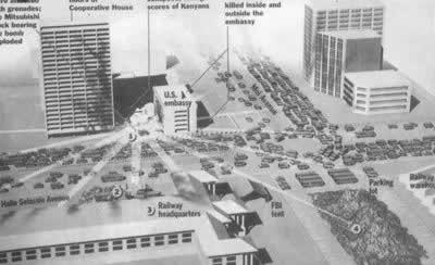 肯尼亚和坦桑尼亚被美国务院列为低危险国家,谁也不会想到美国在这两个国家的大使馆会成为恐怖分子袭击的目标。发生在肯尼亚首都内罗毕的爆炸极具破坏力。爆炸大约发生在当地时间上午10点35分左右,美大使馆后半部分被炸毁。由于装满炸药的汽车是停放在使馆后面一幢四层大楼前,这幢大楼几乎被夷为平地。大楼里主要是办公区及一个秘书学校,估计被炸毁的大楼里埋有许多人。与该楼相邻的一幢22层高的银行大楼的窗户玻璃都被震碎。当时在18楼刚结束记者招待会的美国驻肯尼亚女大使布什内尔及肯尼亚贸易部长受了轻伤。据目击者说,街上10务个行人及附近3辆公共汽车上的乘客都在爆炸中『化为灰烬』。据最新消息,在内罗毕发生的爆炸中共有147人死亡,其中美国人11个,4257人不同程度地受伤,另有154人下落不明。