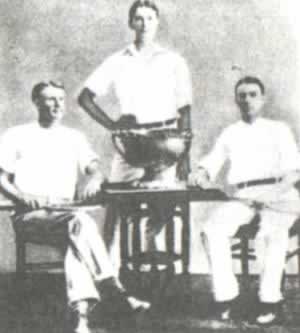 德杯特-戴维斯和队友们1900年8月10日,美国队的德杯特-F-戴维斯和霍尔库姆-沃德击败了客队英国的两名选手E-D-布莱克和H-R-巴雷特,捧走了戴维斯前一年2月捐赠并以他的名字命名的国际草地网球赛的奖杯。两场单打获胜