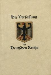 1919年的《德意志国宪法》。因在魏玛地方制定而得名。1918年制定 ,1919年8月11日生效。全文共181条,分两编。第一编为联邦的组织及其职责,分联邦及各邦、联邦议院、联邦总统及联邦政府、联邦参议院、联邦立法、联邦行政、司法7章。规定德国为联邦 ,主权在民。人民有普选权、创制权。采用责任内阁制,但总统有紧急命令权,可以暂时停止宪法中部分规定的效力。第二编为德国人民的基本权利及基本义务,分个人、共同生活、宗教及宗教团体、教育及学校、经济生活5章。第二编表现出这部宪法的特色,规定了个人的各种基本权利和许多社会生活的准则,其中有一些社会民主主义性质的规定。