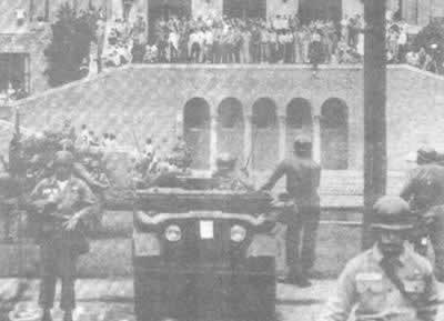 1959年8月12日,由250人组成的一群敌对分子聚集在阿肯色州小石城的中心学校外面,抗议学校允许黑人 进学校学习。两名黑人在发出嘲笑声的白人示威者当中走进学校的前门。警察和消队队员们使用棍棒和水龙阻止白人示威者接 近黑人。21名抗议者因使用暴力和拒绝听从警察命令而被逮捕。但是,同两年前在中心学校发生的暴乱相比,这次骚乱要温 和得多。