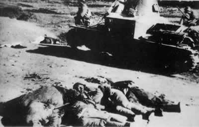 日军乘重型坦克进行攻击,坦克旁是中国士兵的尸体