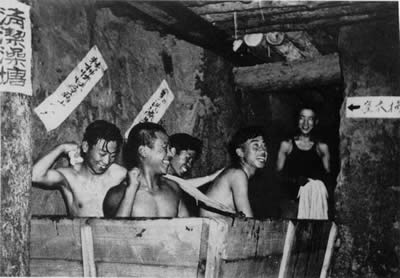 志愿军战士在坑道澡堂洗澡