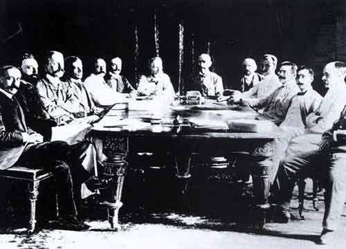 图为11国公使--组成联军的八国加上西、比、荷三国,在共同商讨对中国的议和大纲。从1900年10月到是年年底,11国围绕谈判内容,争执不休,直到12月24日才统一了意见,向清政府提出了有12条条款的"议和大纲"。清政府被迫一条不改地接受列强的"议和大纲"为既定条约。这个大纲里,"道歉"、"惩凶"、"驻军"、"赔款"……但凡一个国家所珍惜的主权被践踏殆尽。这个议和大纲是《辛丑条约》的蓝本