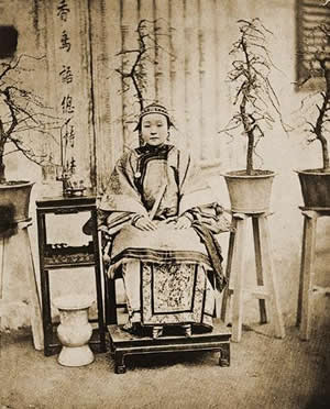 图中女子是时任云南府厘金局(相当于现在的税务局、海关)局长的太太,为当时昆明城内有名的美女,照片中她所拥有的一切也无不体现出那个时代的美学:圆满姣好的面相可以『望夫』,三寸金莲意味着『妇道』,加上宽大繁复的衣裙表明她完全脱离劳动;在服饰上她钿、环、戒齐全,金玉交辉,胸前挂着怀镜(抑或是香包、怀表?),镯子更是成双成对地在手上堆积;左手执一帕大概是女红作品,右手执一扇与背后诗联则是风雅所需;磁器茶杯与水烟杆为当时通用的身份地位象征,旁边一叠经书(《素女经》之类)也是每个淑女之必备。这一切与她身后的那些盆景在精神上有着千丝万缕的联系,不过这种关于限制与矫饰的精巧美学注定将因人非草木而从后代妇女身上消逝。