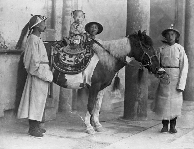 1880年,儿时的光绪帝在皇家护卫看照下骑马。四岁登基,起初由慈安、慈禧两宫太后垂帘听政,光绪七年慈安太后崩逝后由慈禧太后垂帘听政,直至光绪帝十八岁亲政,此后虽名义上归政于光绪帝,实际上大权仍掌握在慈禧太后手中。