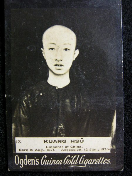 1900年英国鄂丁香烟公司发行大清光绪皇帝真像照片卡 (珍贵)。整个维新不过历时103天,故称『百日维新』。1908年11月14日光绪帝病死,享年38岁,葬于清西陵的崇陵。