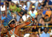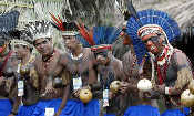 身着盛装的巴西帕塔肖族跳起民族舞蹈