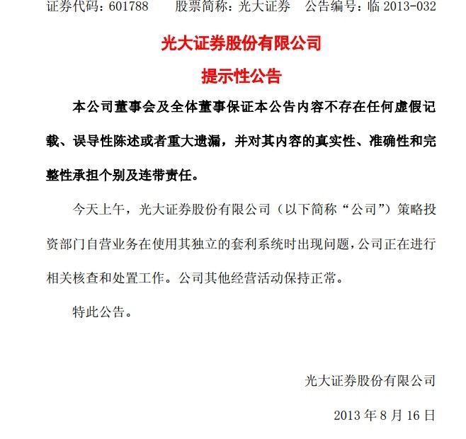 14:22 光大发布正式公告,承认套利系统出现问题。