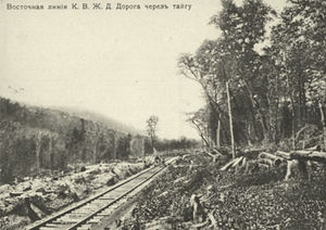 东清铁路通过原始森林的路段(1905年),明信片1897年8月16——中东铁路正式开工东清铁路指沙俄修筑的从俄国赤塔经中国满洲里、哈尔滨、绥芬河到达海参崴(符拉迪沃斯托克)的铁路中在中国