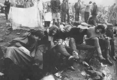 1968年8月15日-17日,在伍德斯托克举行了大型音乐节。这 次音乐节成了世界上最大规模的嬉皮士聚会,40万年轻人不顾交 通阻塞、食品与饮水短缺和倾盆大雨等因难,发疯般地随着刺耳 的音乐摇晃。他们的长发束带、穿着喇叭裤或粗布蜡染衬衫,在 泥浆里的湿睡袋中性交,吸食大麻,如同呼吸空气一般。