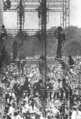 人群的数量比人们预料的要多两倍。报道说场地周围20英里 的公路上交通陷于停滞。数千人丢弃了汽车,经过纽约的贝塞尔 小镇,涌向靠近伍德斯托克的音乐艺术市场地。这是一块属于马 科斯-亚斯格尔的面积为600英亩的奶牛场。马科斯专为此举借出 了这片土地。
