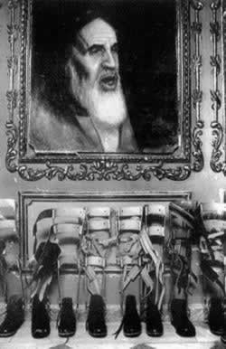 当双方的军事指挥官宣布停止敌对行为时,士兵们都高举武器欢呼起来。后面的霍梅尼像在战争中被子弹打出了无数孔洞
