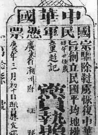 附:同盟会宣言(摘录)1905年8月20日 天运岁次年月日中华国民军都督奉军政府命,以军政府之宗旨及条理,布告国民。