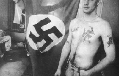 新纳粹毫不掩饰自己浑身怪异猛兽的纹身和房间里的纳粹旗