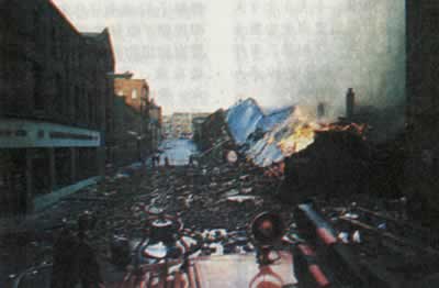 爱尔兰共和军的炸弹引起的大火在贝尔法斯特街头熊熊燃烧