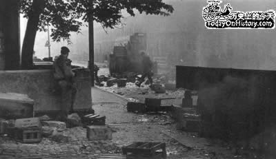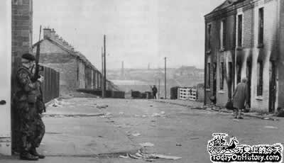 英国军队查勘巷战之后的贝尔法斯特街区1971年8月25日,当英国政府行使紧急状态权力,对爱尔兰共和军中的一些可疑领导人实行预防性禁闭后,北爱尔兰发生了暴乱。首相布赖恩-福克纳声称,这些紧急措施对于保护北爱尔兰