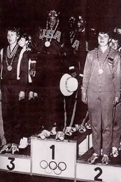 威尔玛-鲁道夫(中)第三次站在罗马奥运会冠军领奖台上