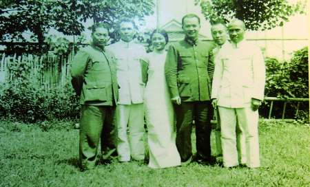 1937年8月,国共两党和平谈判期间摄于南京黄宅庭院。(右起:朱德、周恩来、黄琪翔、郭秀仪、叶剑英、张群)
