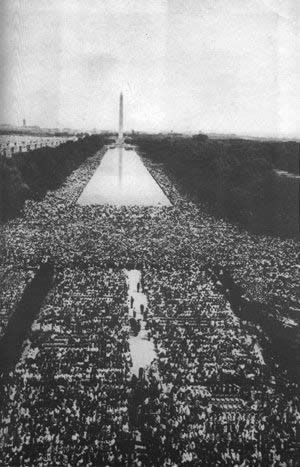 正当国会在辩论该民权法案时,1963年8月28日,美国群众开始了『为工作和自由向华盛顿的进军』。来自美国50个州的20多万黑人以及白人举行了华盛顿有史以来规模最大的示威。上午11时,游行队伍从华盛顿纪念碑出发,分成两路纵队,行进到林肯纪念堂,他们提出了『立即自由』、『我们要工作』、『我们为立即成为一等公民而进军!』等口号。马丁-路德-金、菲利普-伦道夫等黑人领袖向示威群众发表演说。华盛顿自由进军把黑人运动推向了一个新阶段。