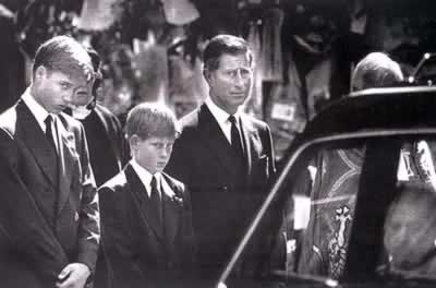 戴安娜的葬礼。左起是她的两个儿子及前夫查尔斯王子