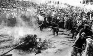 达孜县塔杰乡、章多乡翻身农奴在焚烧农奴主高利贷、人身依附等文契。