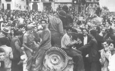 1943年9月盟军在意大利萨勒诺登陆后,快速向前推进,意大利群众纷纷走出家门,欢迎盟军的到来