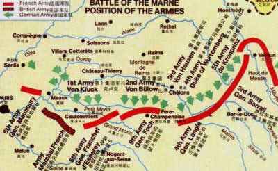 马恩河会战是第一次世界大战初期发生在法国境内马恩河地区的一次重要战役。1914年8月,德军同法、英军队 在法国边境展开激战,双方共投入350万大军。法军和英军被迫南撤。9月3日,德军越过马恩河。5日,法军主力经过重新部署,在马恩河一带200公里战线上开始反击德军,至9日迫使贸然南进的德第一、二集团军撤退到马恩河以北至凡尔登 一线。马恩河战役使德军包抄法军的计划失败,德国在西线速决战略破产,总参谋长毛奇被德皇威廉二世撤职,改由法金汉担 任。