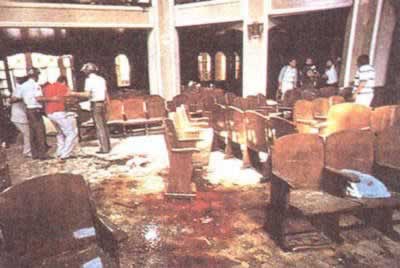 1986年9月6日。事先没有发出任何警告,两名携枪的阿拉伯人闯入伊斯坦布尔的一座犹太教堂。用机枪和手榴弹开火,致使做礼拜的29人中有21人丧生,4人受伤。警察听到枪声赶到后,教堂内又发出一阵爆炸声,很显然,恐怖分子已被炸死。