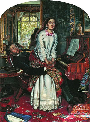 良心觉醒(The Awakening Conscience),1851年。这是维多利亚时期首幅描绘娼妓问题的画作。一名被包养的情妇在与富家子弟弹琴作乐时,突然被窗外和炯而庄严的阳光所震慑而良心觉醒。