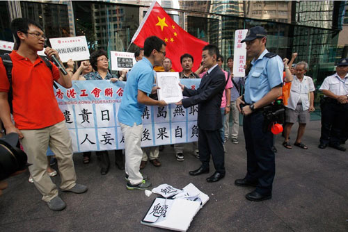 9月11日,香港工联会一批成员游行至香港交易广场向日本驻港领事馆递交抗议书,强烈反对日本窃占中国领土钓鱼岛。