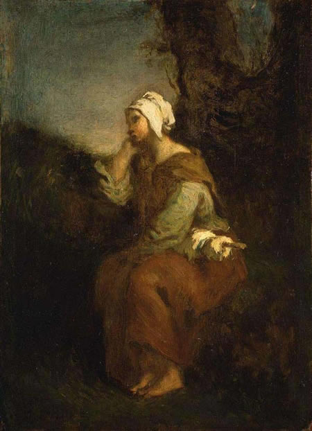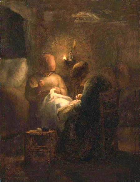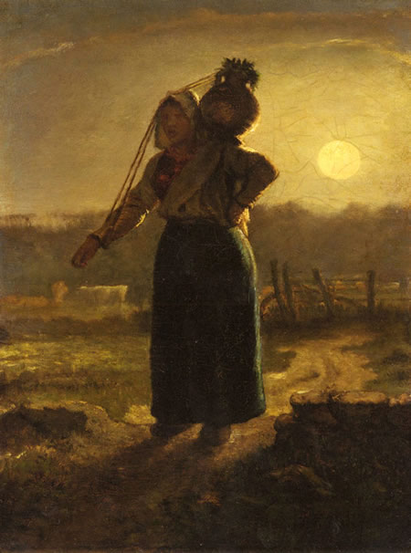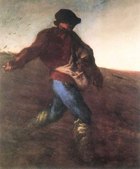 米勒在巴黎贫困潦倒,亡妻的打击和穷困压得他透不过气来。为了生存,他用素描去换鞋子穿,用油画去换床睡觉,还曾为接生婆画招牌去换点钱,为了迎合资产者的感官刺激,他还画过庸俗低级的裸女。有一次他听到人们议论他说:『这就是那个除了画下流裸体、别的什么也不会画的米勒。』这使他伤透了心。从此他下决心不再迎合任何人了,坚决走自己的艺术道路。他在巴比松的第一幅代表作品是《播种者》。以后相继创作了《拾麦穗》和《晚钟》等名作。