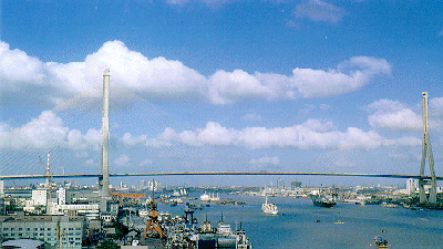 世界第一斜拉桥--杨浦大桥,于1991年4月29日动工,1993年9月15日建成,历时仅2年5个月。大桥全长7658米,其中主桥1172米,中孔跨度602米,两岸桥塔高208米,为倒『Y』钻石型,桥塔两侧各有32对共256根鹅黄色拉索将桥面凌空悬起,索面成立体扇形布置,蔚为壮观。最长的一根拉索由301根直径7毫米的强钢丝编织而成,长328米,重33吨。主桥面宽30.35米,设6车道,两旁各有2米人行道,两岸有电梯上下,供人观光游览。大桥设计车速为每小时60公里,日通行能力5万辆,桥下净空48米,可通行5.5万吨级轮船。